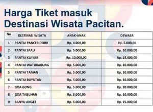 Harga tiket masuk destinasi wisata di Pacitan sangat murah dengan kisaran Rp. 5.000,- sampai Rp. 20.000,-. Silakan saudara untuk berkunjung ke Pacitan. semoga kita semua selalu diberikan kelancaran, keselamatan dan keberkahan dalam aktivitas hari ini. Amiin YRA. (*)