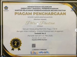 Berdasarkan evaluasi KPPN Pacitan untuk periode Januari–Mei 2025, kami berhasil meraih peringkat terbaik ke-2, dalam kategorm Satuan Kerja yang Memiliki Pagu > 10 M dengan Nilai Indikator Kinerja Pelaksanaan Anggaran Terbaik Ke-2.