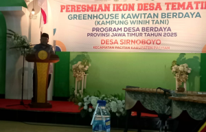 PRABANGKARANEWS, PACITAN — Kepala Dinas Pemberdayaan Masyarakat dan Desa (PMD) Provinsi Jawa Timur, Budi Sarwoto., meresmikan ikon desa tematik Greenhouse Kawitan Berdaya (Kampung Winih Tani) di Balai Desa Sirnoboyo dan dilanjutkan pada lokasi Greenhouse Kawitan, kAMIS (4/12/25).